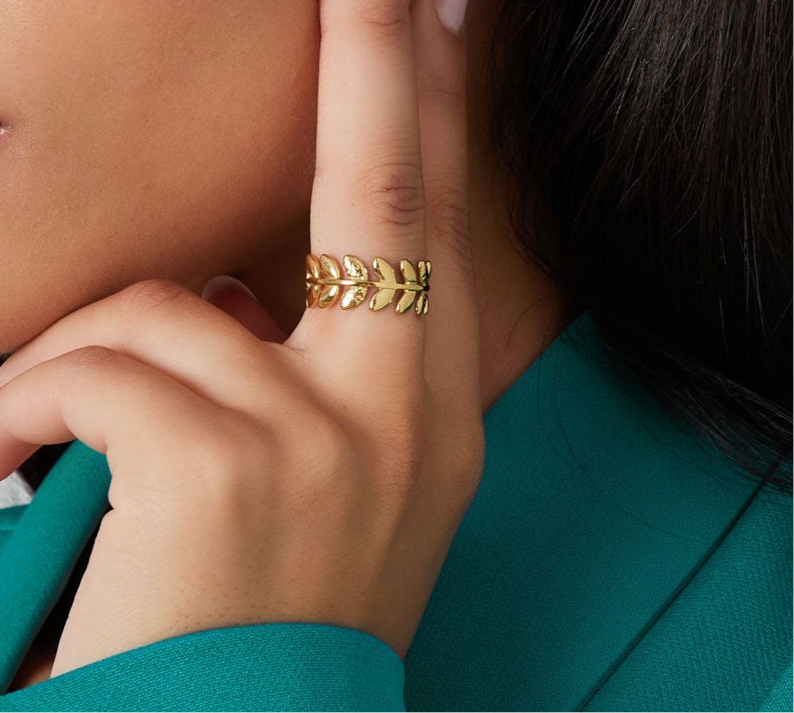 Un delicato motivo a foglie di alloro si intreccia armoniosamente attorno al dito, evocando la bellezza organica della natura e aggiungendo un tocco di eleganza senza tempo al tuo stile. È un gioiello perfetto per chi desidera un accessorio che unisca semplicità e raffinatezza, ideale sia indossato da solo per un look minimal che abbinato ad altri anelli per un effetto più ricco e stratificato.