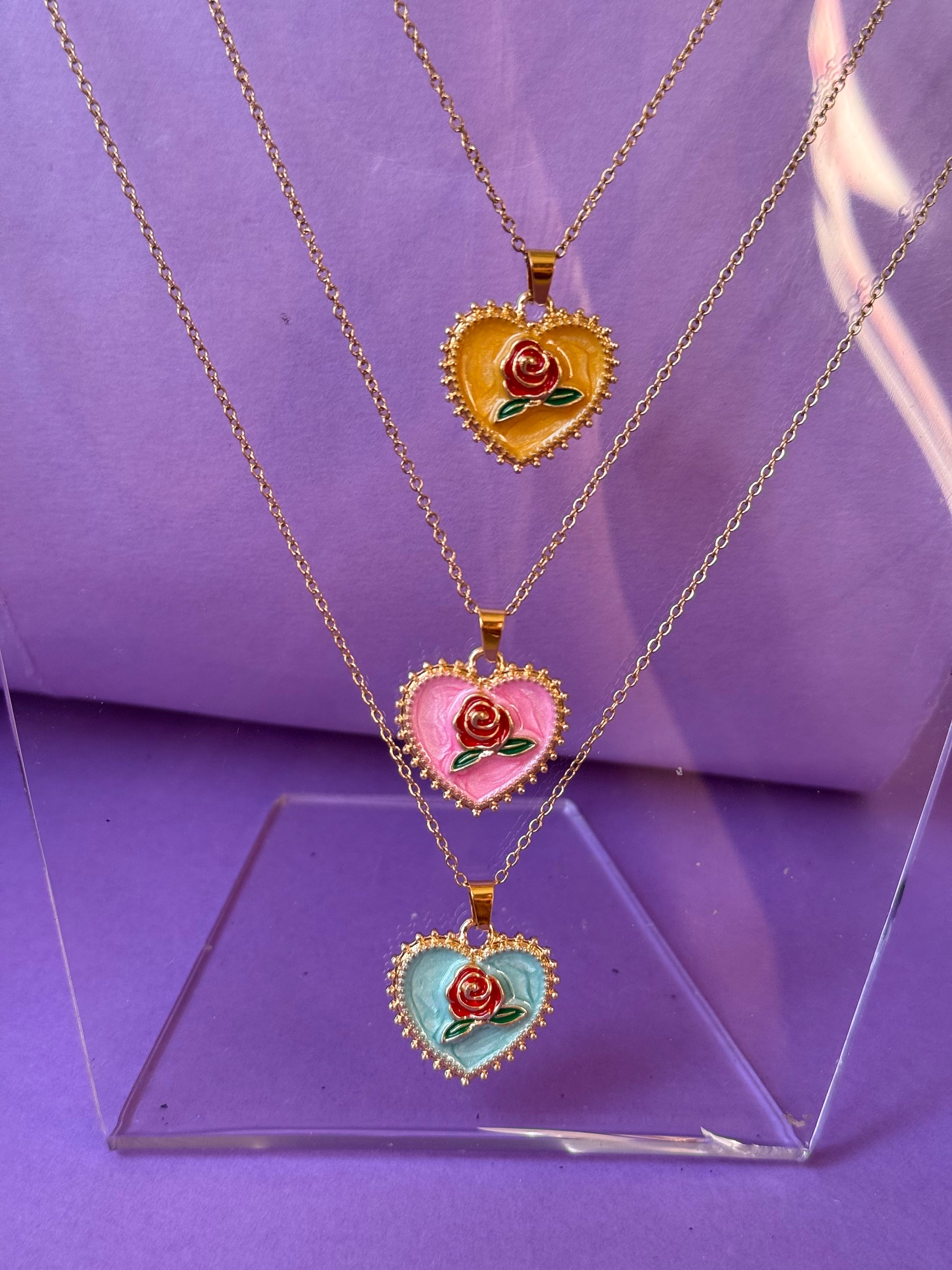 Questa collana è un inno alla femminilità e al romanticismo, perfetta per chi ama i dettagli che fanno la differenza. Il pendente a forma di cuore, con una rosa dipinta al suo interno, è rifinito in smalto lucido e bordato con piccole sfere in rilievo che aggiungono un tocco di eleganza e raffinatezza. La catenina sottile, in acciaio inossidabile, la rende delicata e versatile.