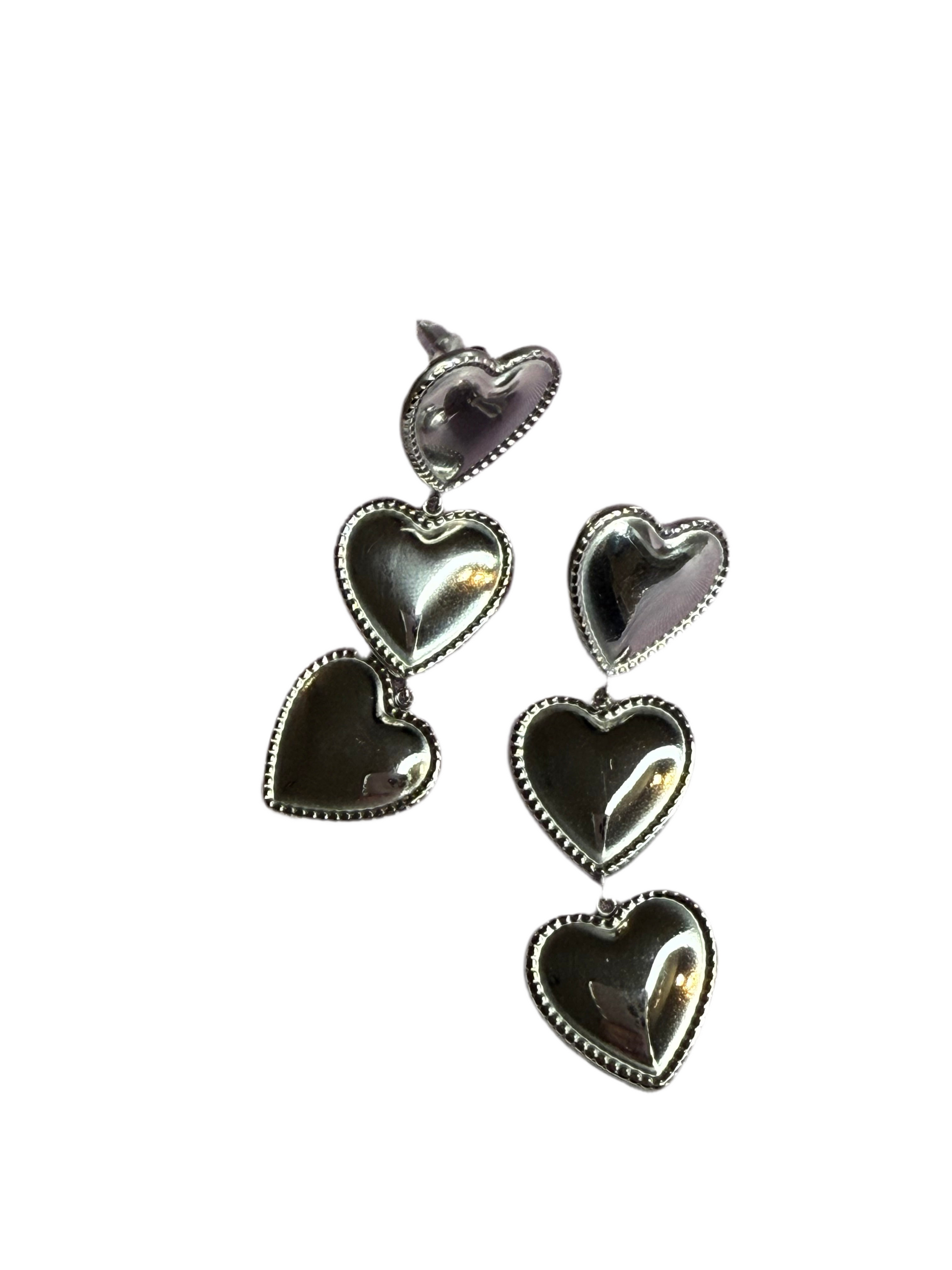 perfetto equilibrio tra eleganza e romanticismo. Realizzati in acciaio inossidabile di alta qualità, questi orecchini pendenti presentano un design raffinato con tre cuori lisci e lucidi, incorniciati da una bordatura lavorata che dona un tocco di originalità.