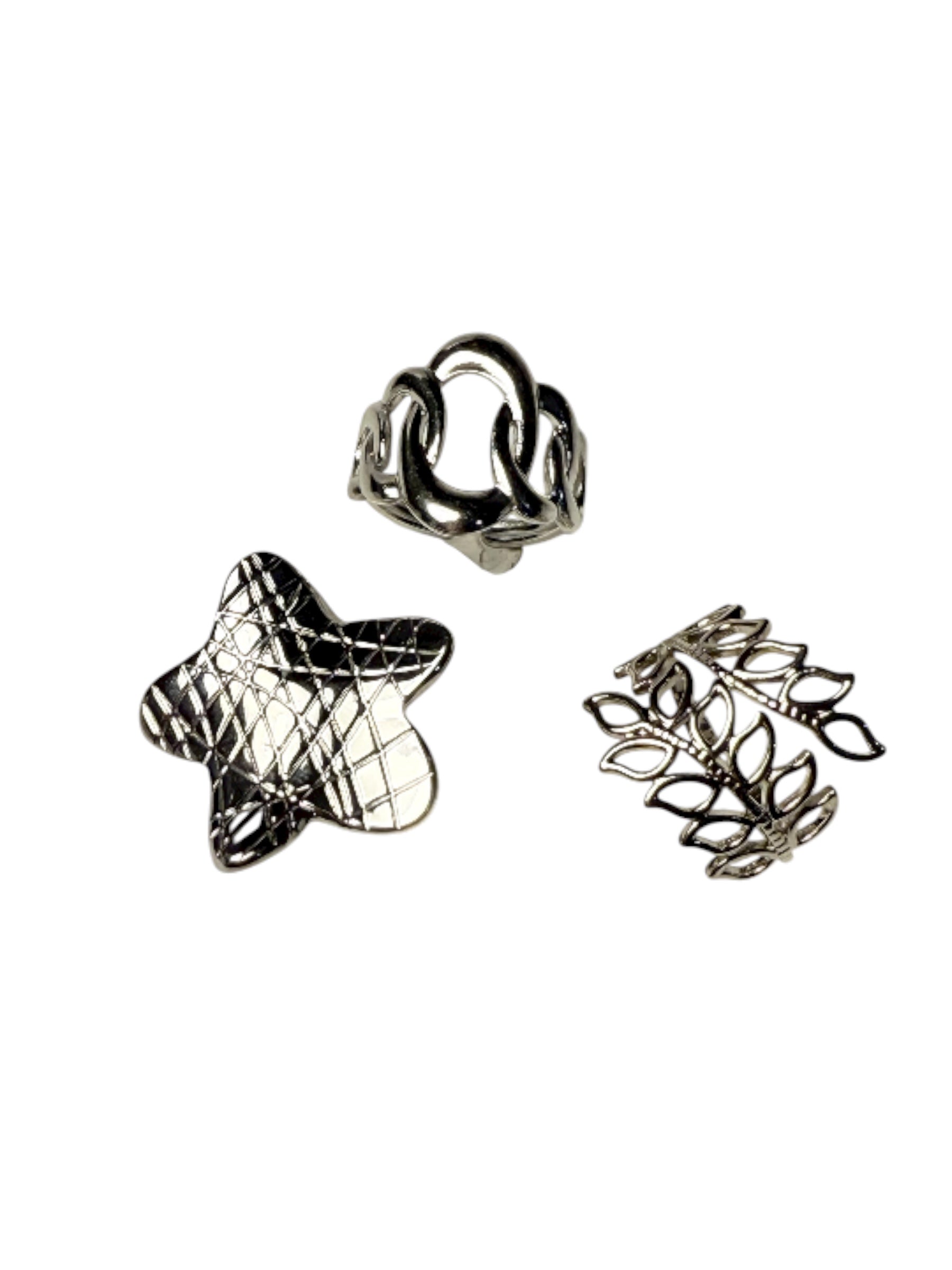 Fai una dichiarazione di stile audace con il Set Star Power, il trio di anelli in tonalità argento pensato per chi non ha paura di farsi notare. Questo set unisce elementi chunky a dettagli naturali per un look di grande impatto e massima personalità. Perfetto per mani audaci e unghie colorate!