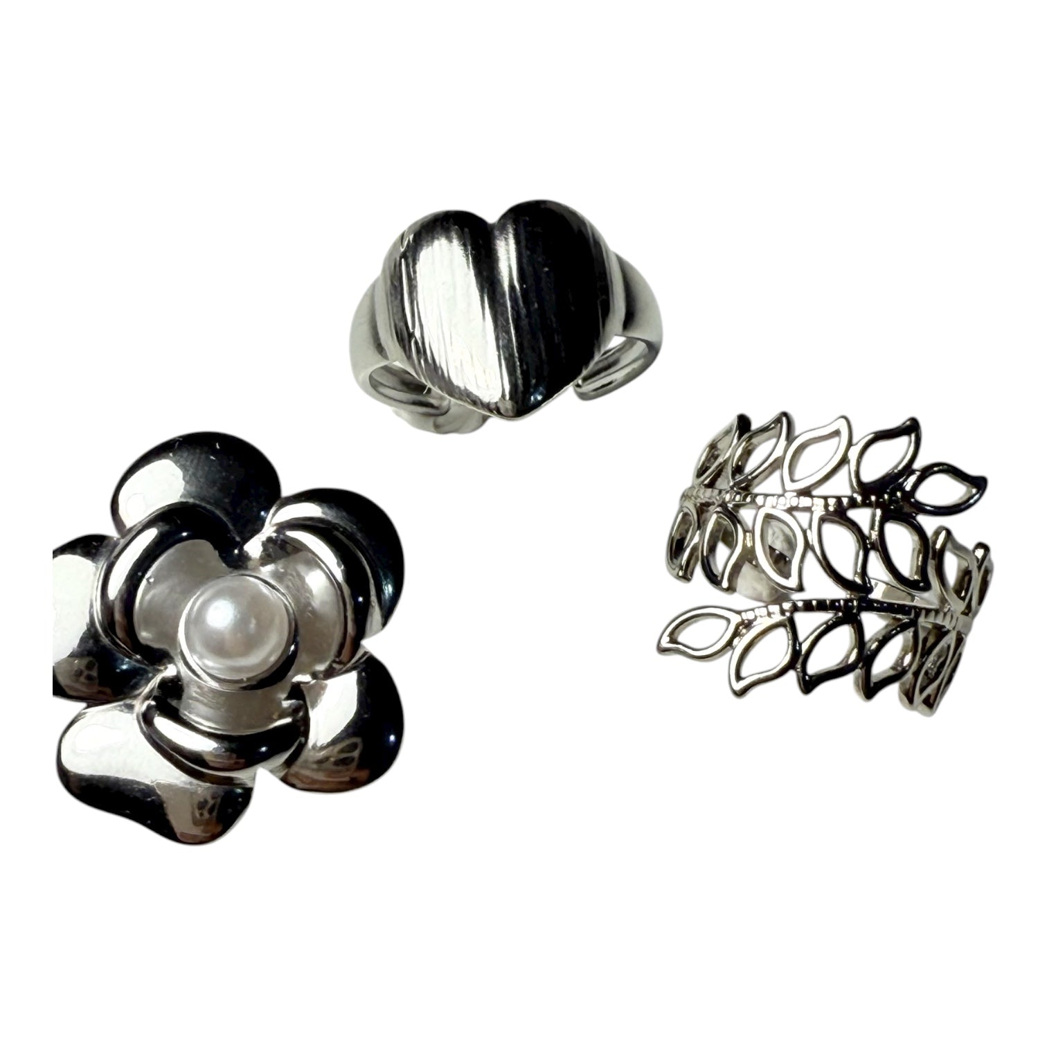 Abbraccia l'eleganza romantica con il Set Romantico Silver, il trio perfetto che celebra l'amore per i dettagli e la bellezza della natura. Questi anelli, tutti in tonalità argento lucido, sono stati scelti per creare un look sofisticato, femminile e incredibilmente chic.