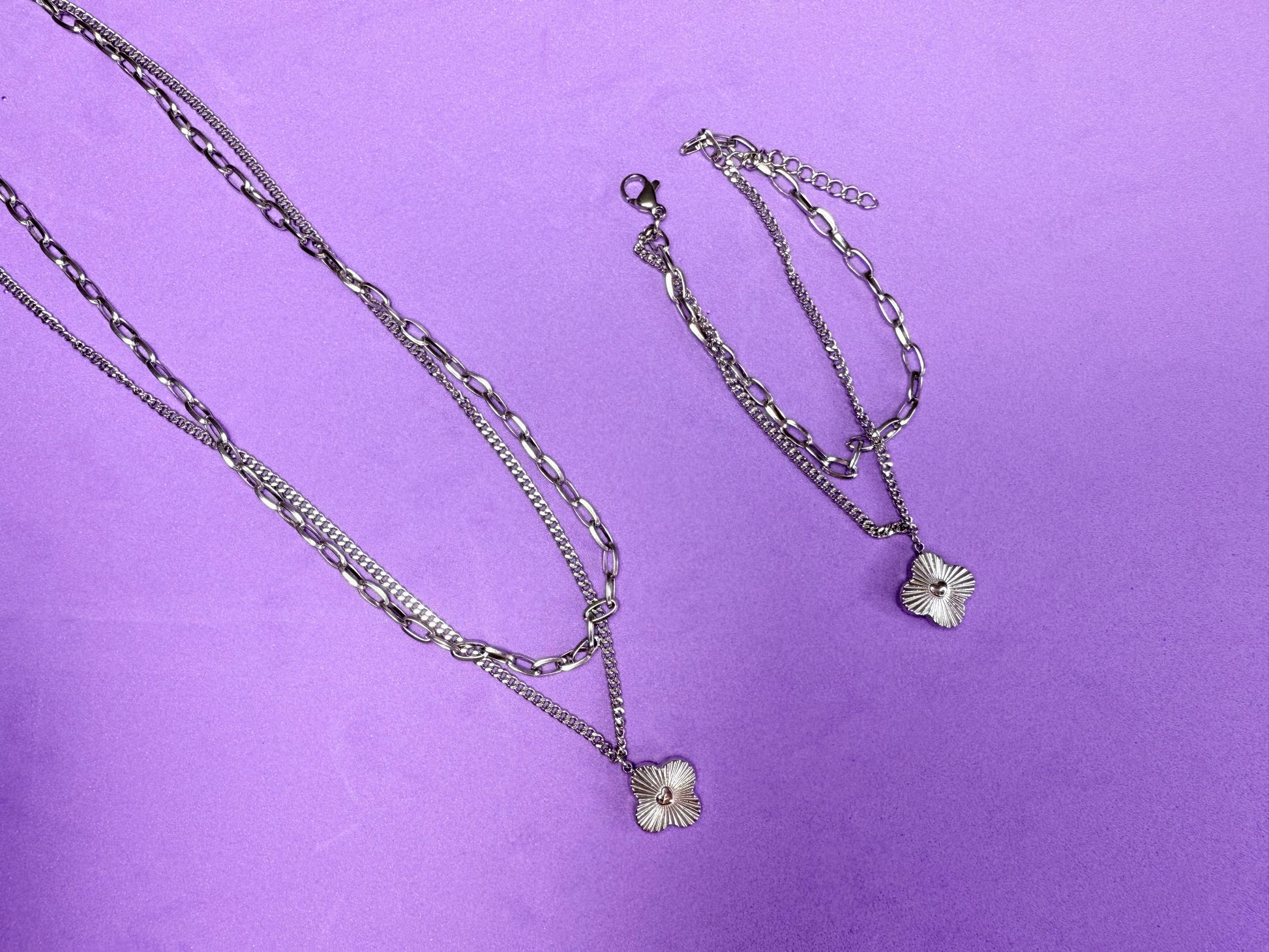 Set composto da collana e bracciale coordinati con doppia catena e ciondolo a fiore in finitura satinata. Uno stile moderno con un tocco delicato.