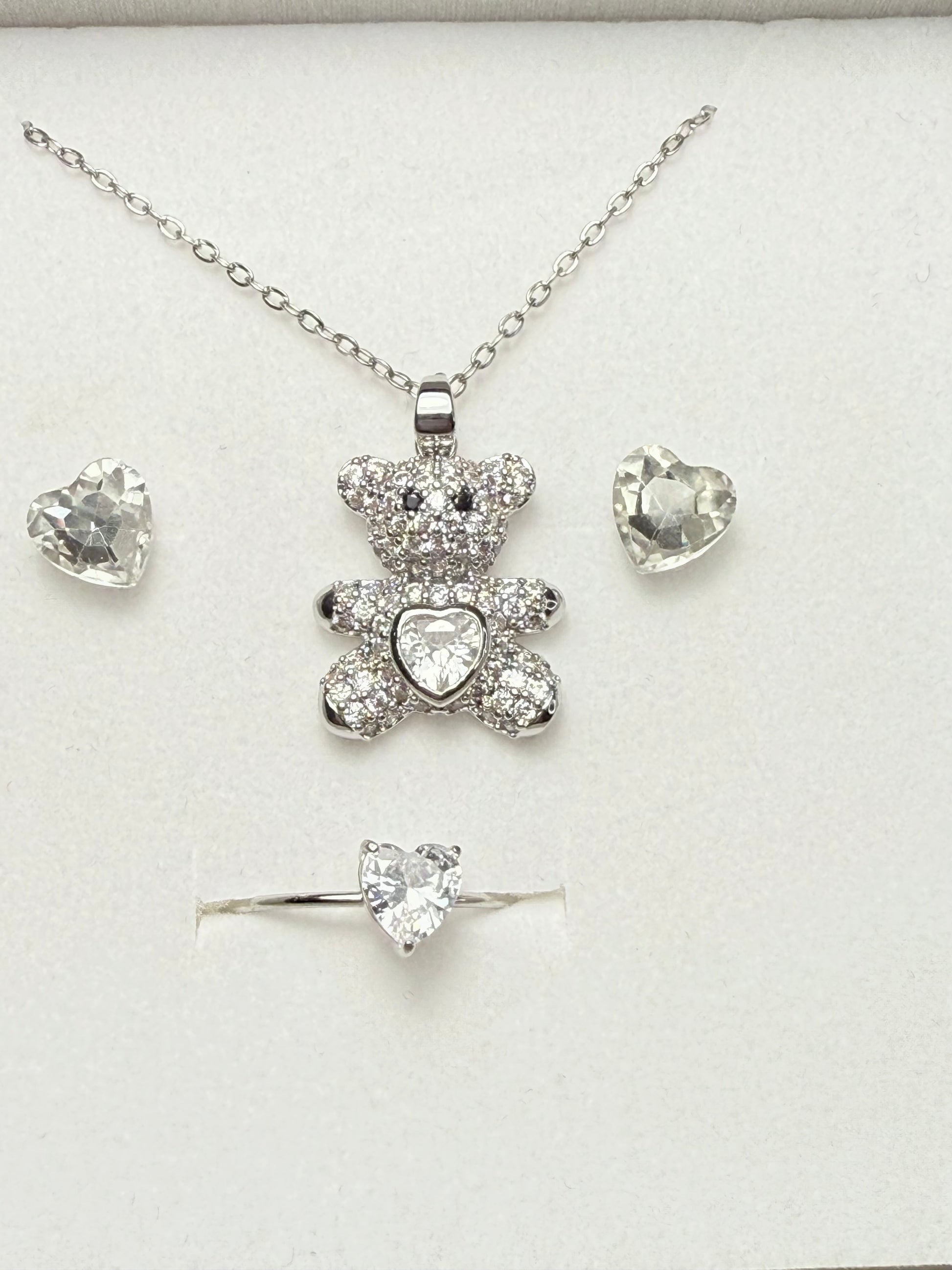 Set composto da collana con ciondolo orsetto pavé, orecchini a cuore sfaccettato e anello dorato con cuore bombato. Look giocoso ma prezioso, ideale per chi ama i dettagli dolci e brillanti.